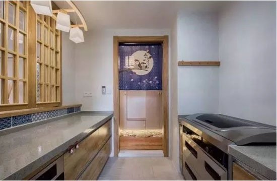 【厨房】厨房没有做门,而是使用了和风的门帘,厨房里面简约的橱柜搭配可翻折的集成灶,让整体空间显得更整洁。