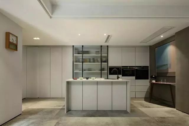 由于男女主人不同的烹饪爱好,设计师特地打造了中西合璧的厨房。西式的厨房由中岛柜和餐厅相隔,微波炉、烤箱等皆安置在开放式的西厨中;冰箱、抽烟机等则安放于玻璃门内的中式厨房里。