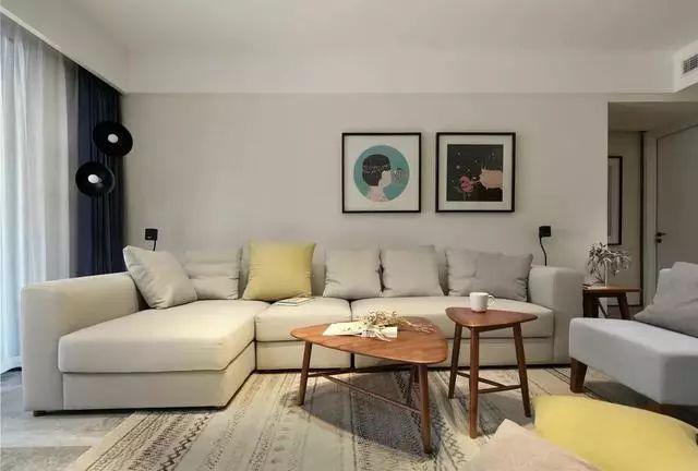 米色的L型布艺沙发,宽大舒适,午休便可躺在沙发上休息;穿插一个黄色的抱枕点缀着空间,显得活泼明快。